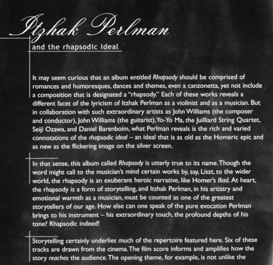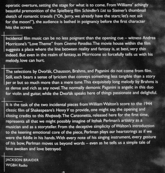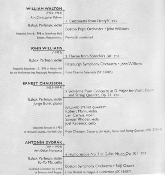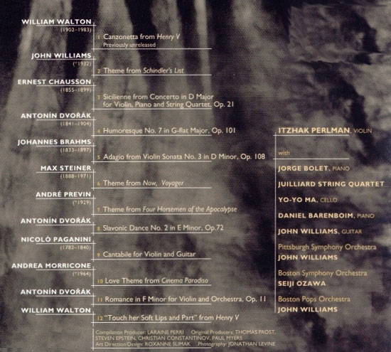 Track Listing 1. William Walton (1902-1983) 2. John Williams (*1932) 3. Ernest Chausson (1855-1899) 4. Antonin Dvorak (1841-1904) 5. Johannes Brahms (1833-1897) 6. Max Steiner (1888-1971) 7. André Previn (*1929) 8. Antonin Dvorak (1841-1904) 9. Nicolo Paganini (1782-1840) 10. Andrea Morricone (*1964) 11. Antonin Dvorak (1841-1904) 12. William Walton (1902-1983)